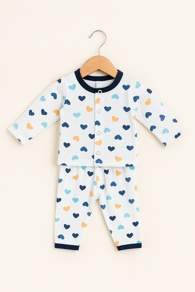 This 2-piece baby nightwear set comes with a button-up top and matching pajama pants, designed with cute blue and orange heart prints. The soft cotton fabric ensures all-night comfort, while the navy blue edging adds a stylish touch. Perfect for infants and toddlers, ideal for bedtime or casual wear.