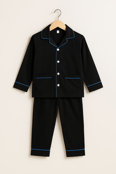 Add a touch of elegance to bedtime with this Kids Black Cotton Night Suit. Designed with soft, breathable fabric, it includes a button-up shirt with white buttons, stylish blue piping, and front pockets, paired with comfy pajama bottoms.